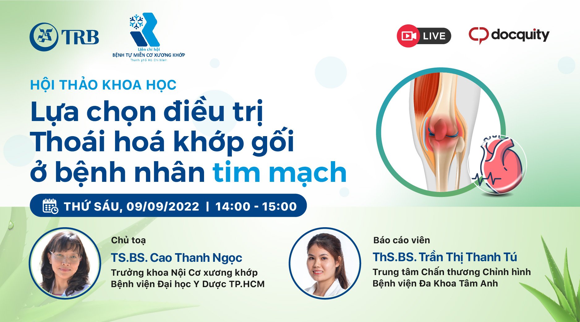 Trân trọng kính mời Quý anh chị đồng nghiệp tham gia buổi Hội thảo trực tuyến của LCH Bệnh tự miễn cơ xương khớp TP. HCM, công ty TRB và Docquity phối hợp tổ chức với chủ đề “LỰA CHỌN ĐIỀU TRỊ THOÁI HOÁ KHỚP GỐI Ở BỆNH NHÂN TIM MẠCH”. Buổi hội thảo có sự tham gia của: - Chủ toạ: TS. BS Cao Thanh Ngọc - Báo cáo viên: ThS....