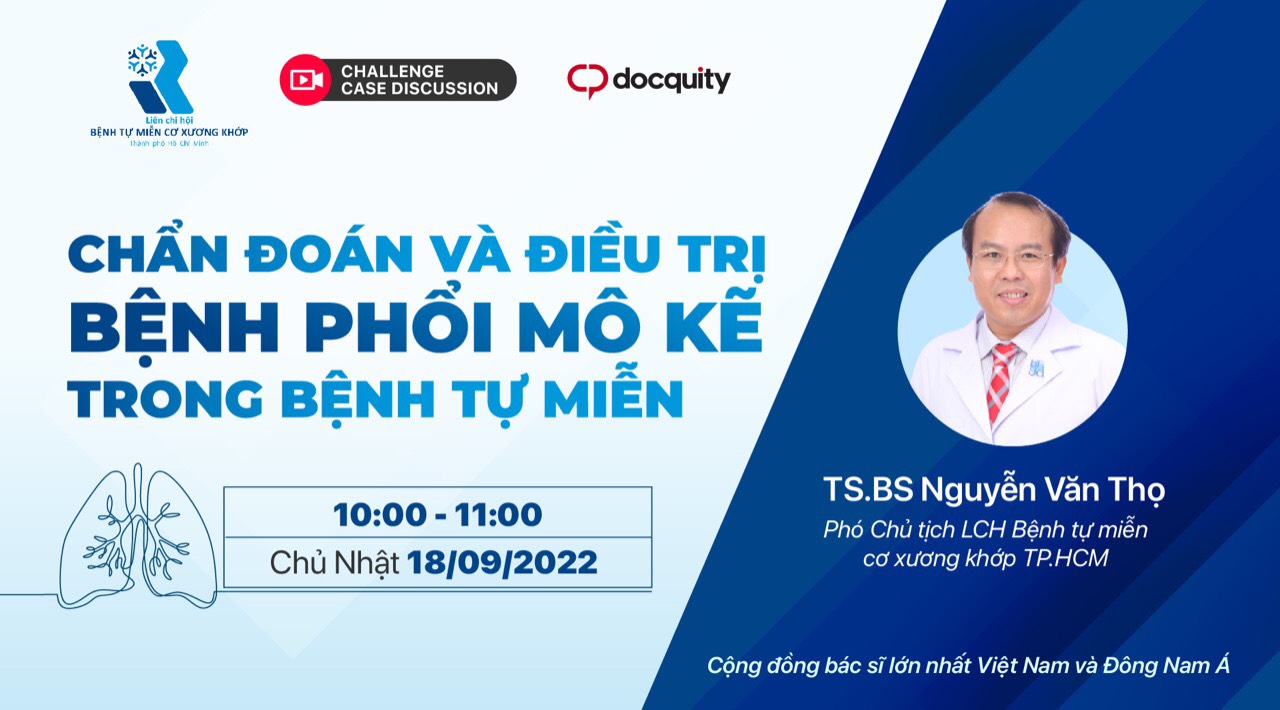 Kính mời Quý anh chị đồng nghiệp đăng ký tham gia Buổi Hội thảo trực tuyến của LCH Bệnh tự miễn Cơ Xương Khớp TP. HCM & Docquity phối hợp tổ chức, với chủ đề “Chẩn đoán và điều trị bệnh phổi mô kẽ trong bệnh tự miễn” do TS. BS. Nguyễn Văn Thọ trình bày. Thời gian: 10:00 sáng Chủ Nhật 18/09/2022 ---------------------------------------------------------- — Đối với các BS đã có tài khoản...