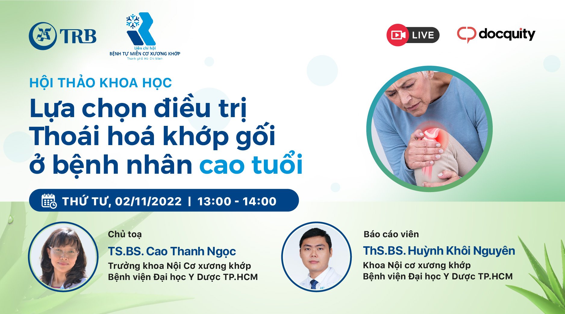Trân trọng kính mời Quý anh chị đồng nghiệp tham gia buổi Hội thảo trực tuyến của LCH Bệnh tự miễn cơ xương khớp TP. HCM, công ty TRB và Docquity phối hợp tổ chức với chủ đề “LỰA CHỌN ĐIỀU TRỊ THOÁI HOÁ KHỚP GỐI Ở BỆNH NHÂN CAO TUỔI”. Buổi hội thảo có sự tham gia của: - Chủ toạ: TS. BS Cao Thanh Ngọc - Báo cáo viên: ThS....