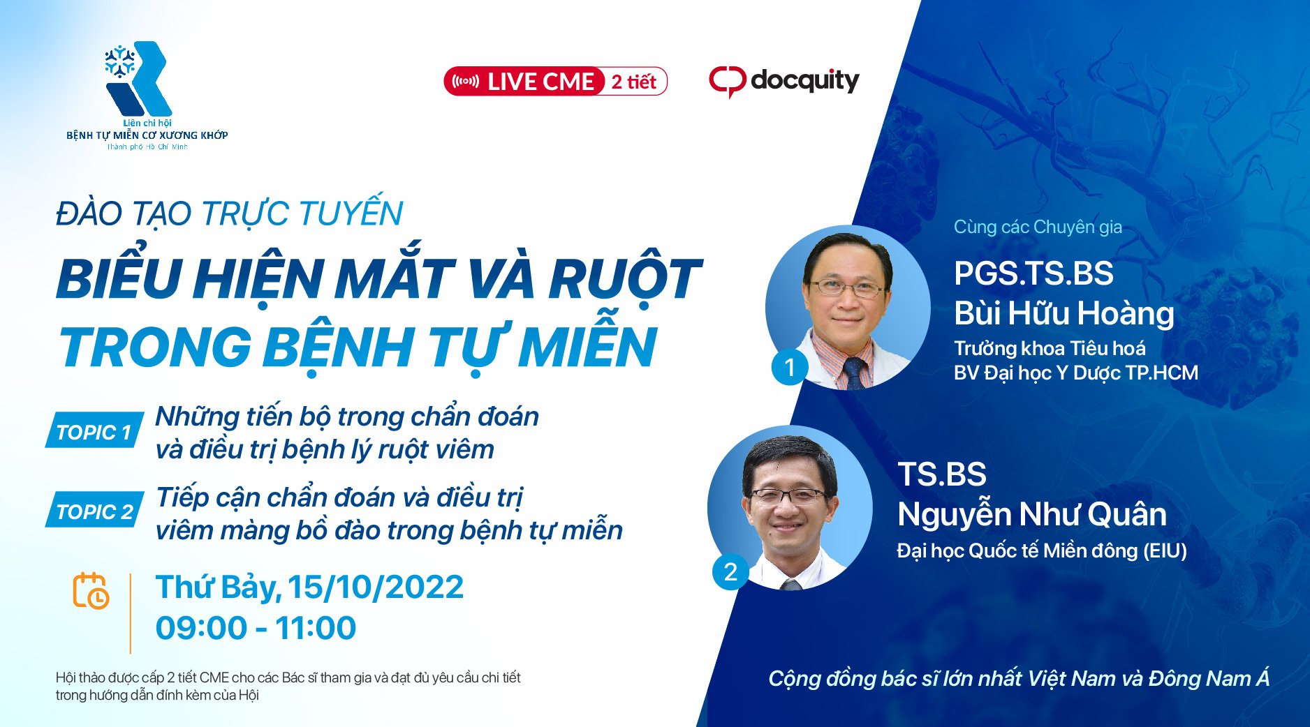 Kính mời Quý anh chị đồng nghiệp đăng ký tham gia Buổi Hội thảo trực tuyến của LCH Bệnh tự miễn Cơ Xương Khớp TP. HCM & Docquity phối hợp tổ chức, với chủ đề “Biểu hiện mắt và ruột trong bệnh tự miễn”. Buổi đào tạo trực tuyến có sự tham gia của các chuyên gia: - PGS. TS. BS Bùi Hữu Hoàng (Trưởng khoa Tiêu hoá - Bệnh viện...