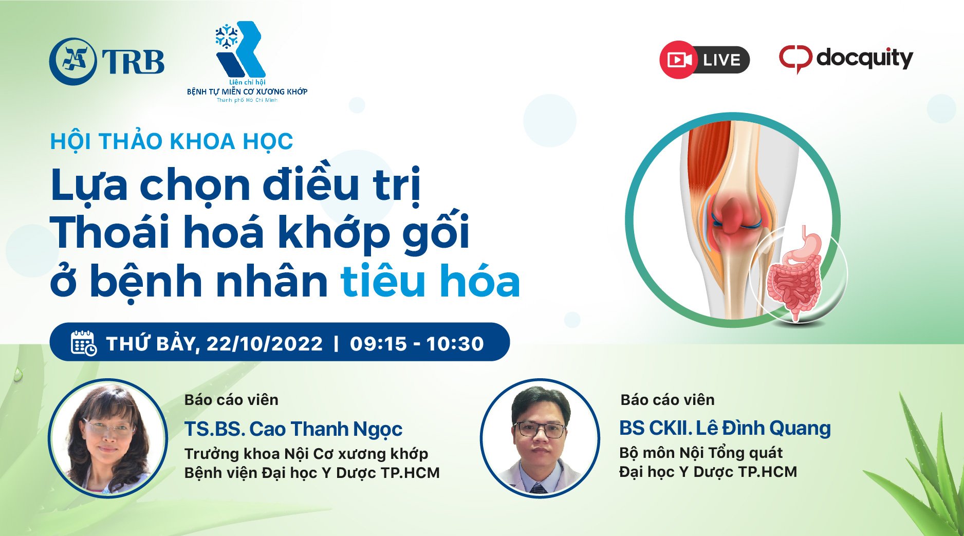 Kính mời Quý anh chị đồng nghiệp đăng ký tham gia buổi Hội thảo trực tuyến diễn ra vào lúc 09:15 sáng Thứ Bảy 22/10/2022 của LCH Bệnh tự miễn Cơ Xương Khớp TP. HCM phối hợp với công ty TRB & Docquity tổ chức, với chủ đề “Lựa chọn điều trị thoái hoá khớp gối ở bệnh nhân tiêu hoá”. Buổi đào tạo trực tuyến có sự tham gia...