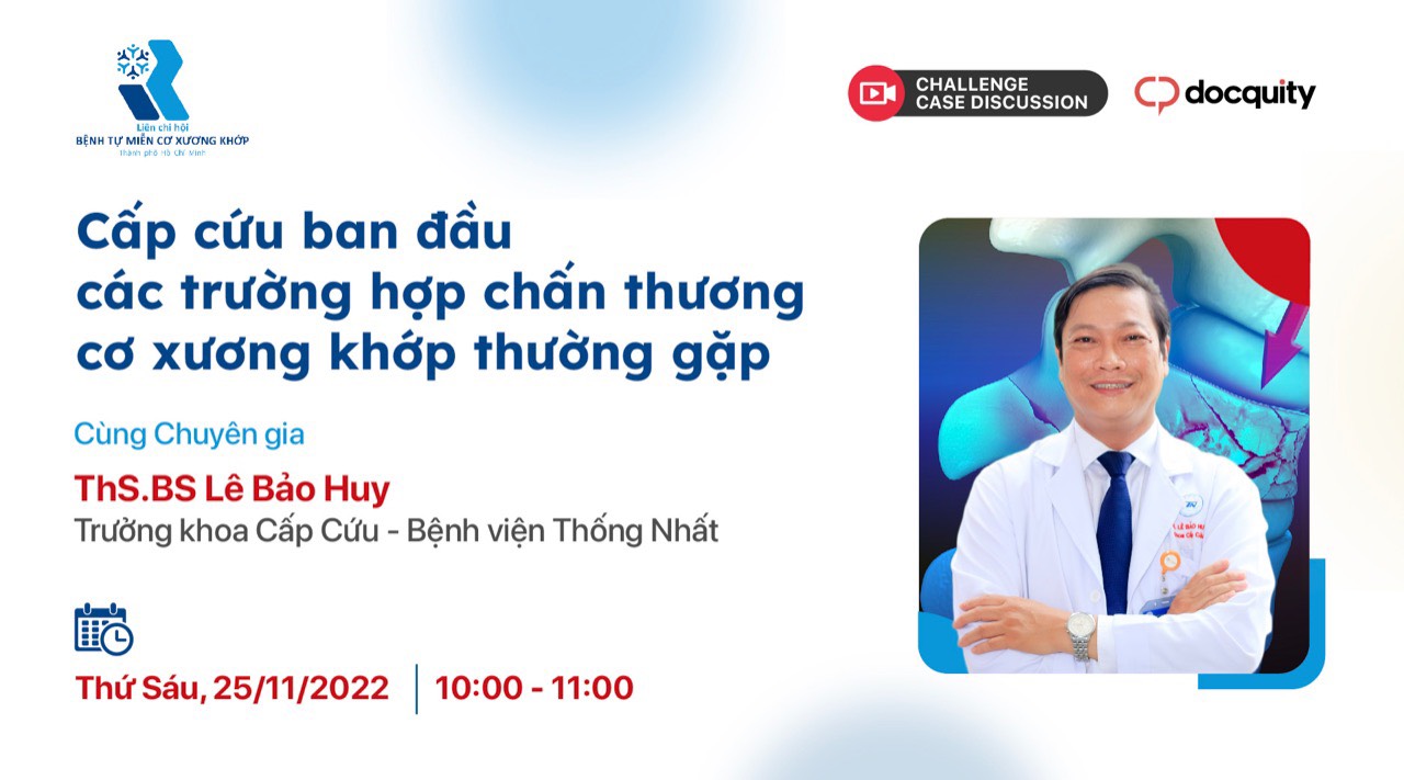 Kính mời Quý anh chị đồng nghiệp tham gia Buổi Hội thảo trực tuyến ra vào lúc 10:00 sáng Thứ Sáu 25/11/2022 của LCH Bệnh tự miễn Cơ Xương Khớp TP. HCM & Docquity phối hợp tổ chức, với chủ đề “Cấp cứu ban đầu các trường hợp chấn thương cơ xương khớp thường gặp”. Buổi đào tạo trực tuyến có sự tham gia của các chuyên gia: - ThS. BS....