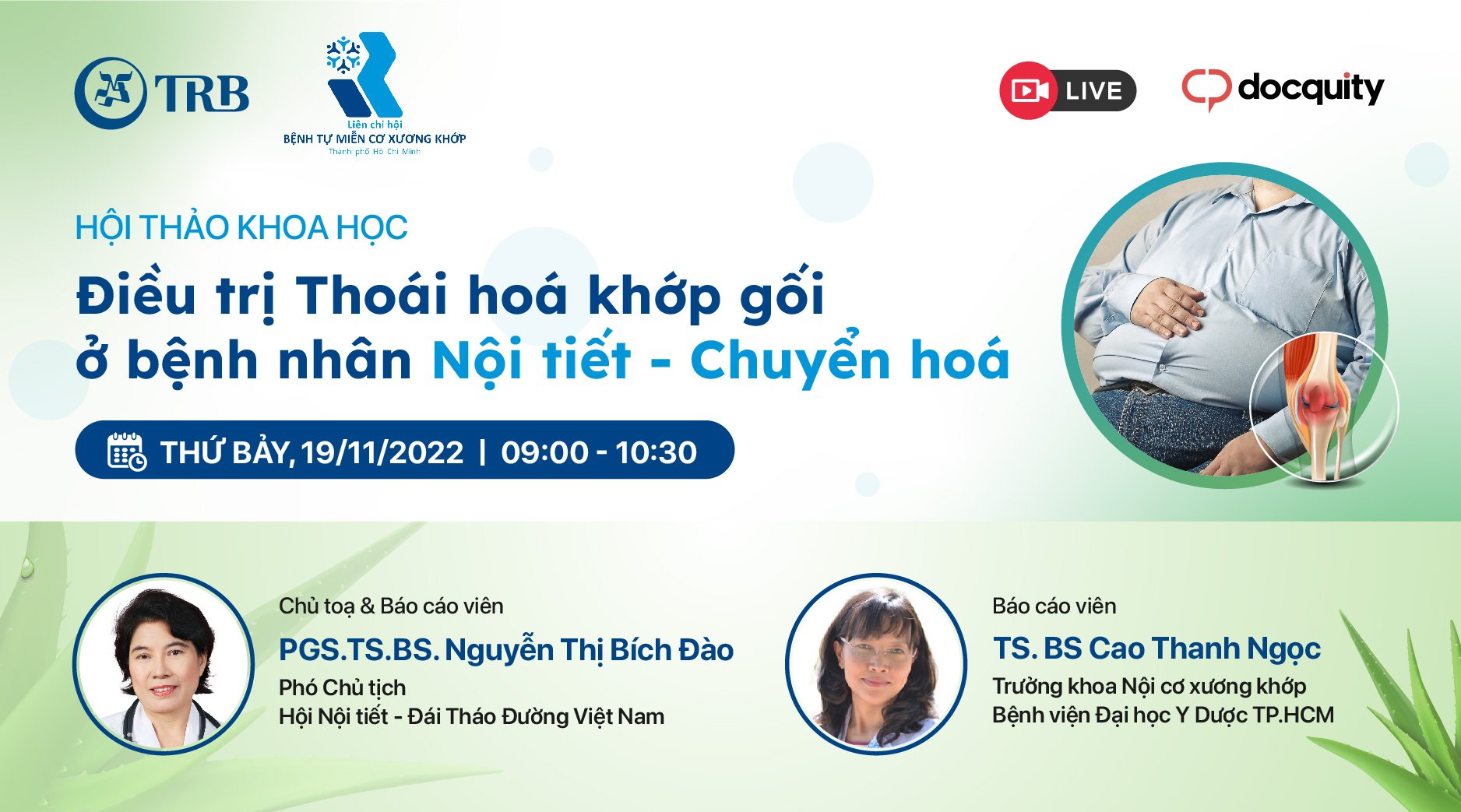 Trân trọng kính mời Quý anh chị đồng nghiệp tham gia buổi Hội thảo trực tuyến của LCH Bệnh tự miễn cơ xương khớp TP. HCM, công ty TRB và Docquity phối hợp tổ chức với chủ đề “LỰA CHỌN ĐIỀU TRỊ THOÁI HOÁ KHỚP GỐI Ở BỆNH NHÂN NỘI TIẾT - CHUYỂN HOÁ”. Buổi hội thảo có sự tham gia của: – PGS. TS. BS Nguyễn Thị Bích Đào (Phó...