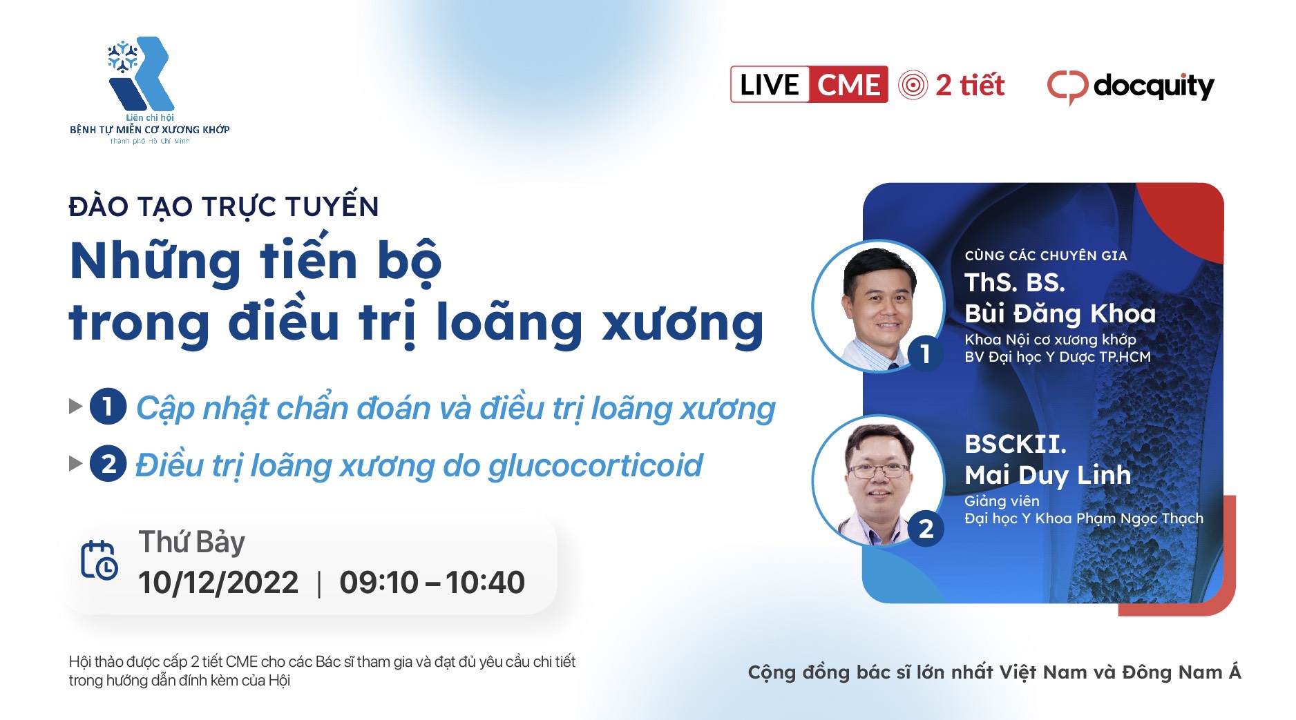 Kính mời Quý anh chị đồng nghiệp đăng ký tham gia Buổi Hội thảo trực tuyến ra vào lúc 09:10 sáng Thứ Bảy 10/12/2022 của LCH Bệnh tự miễn Cơ Xương Khớp TP. HCM & Docquity phối hợp tổ chức, với chủ đề “Những tiến bộ trong điều trị loãng xương”. Buổi đào tạo trực tuyến có sự tham gia của các chuyên gia: - ThS. BS. Bùi Đăng Khoa (Khoa...