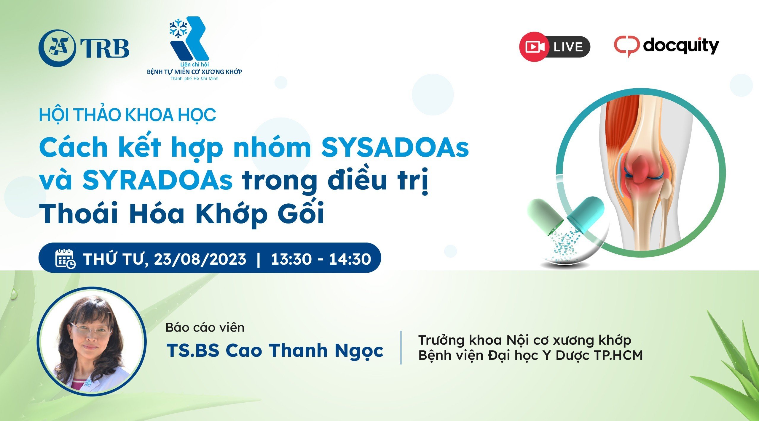 Trân trọng kính mời Quý anh chị đồng nghiệp tham gia buổi Hội thảo trực tuyến của LCH Bệnh tự miễn cơ xương khớp TP. HCM, công ty TRB và Docquity phối hợp tổ chức với chủ đề “Cách kết hợp nhóm SYSADOAs và SYRADOAs trong điều trị thoái hóa khớp gối”. Buổi hội thảo có sự tham gia của: